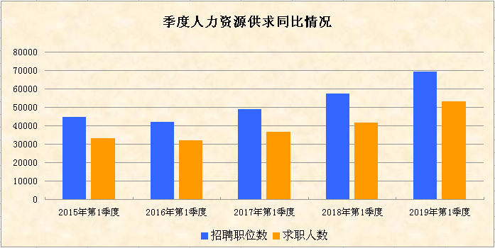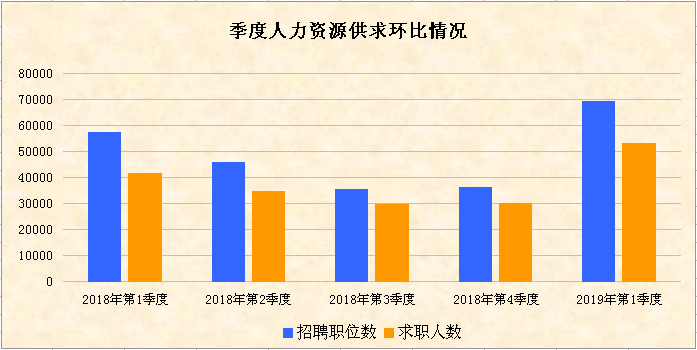 第一季度,我市企业招聘职位数为69354个,比上季度增加了33177个,环比上升91.71%;求职人数为53212人,比上季度增加23301人,环比上升77.9%。与2018年第一季度相比,我市人力资源市场供求规模扩大,招聘职位数和求职人数均有较大增幅,其中招聘职位数同比增加12047个,增幅为21.02%,求职人数同比增加11808人,增幅为28.52%。