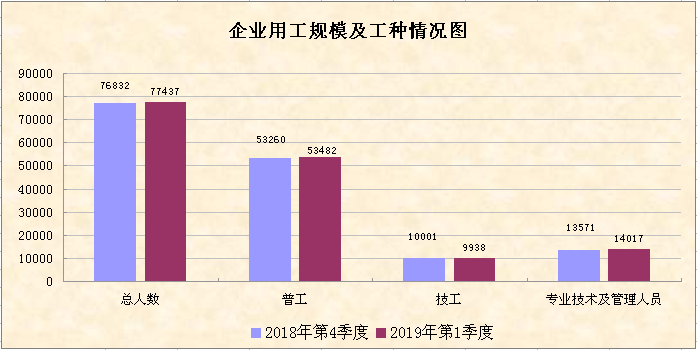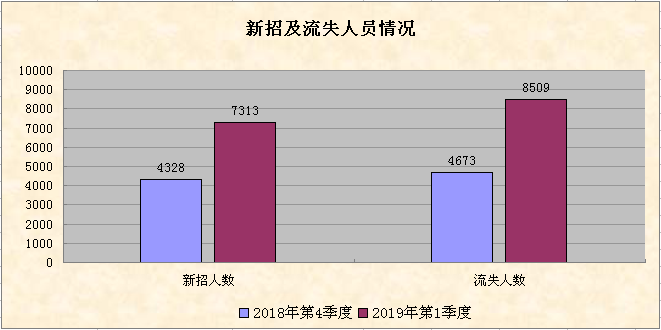 截至2019年第一季度末,全市450家用工定点监测企业实有在岗人数比上年第四季度有所增加,增幅为0.79%;第一季度新招人数比上季度增加2985人,增幅为68.97%,反映企业第一季度的用工需求有所扩大;第一季度流失人数多于新招人数,净流失1196人,比上季度增加851人,用工稳定性较上季度差。截至3月底,全市200家失业动态监测企业实有在岗总人数93207人,比上年12月建档期增加343人,反映企业节后经过员工返岗和新增招聘,用工总量得到有效补充。