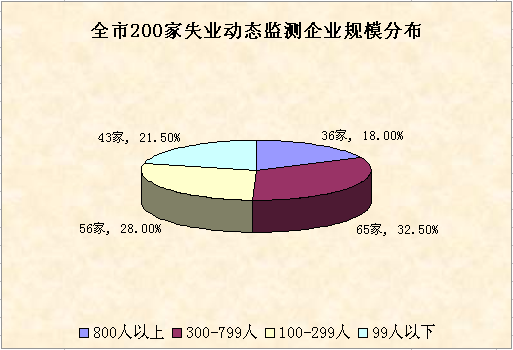 3月末全市失业动态监测共有200家企业,从监测企业规模结构来看,用工规模在800人以上的有36家,占18.0%;300至799人的有65家,占32.5%;100至299人的有56家,占28.0%;99人以下的有43家,占21.5%。