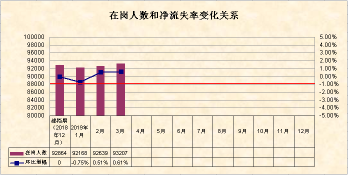 3月末全市监测企业岗位总人数有93207人,比上期企业岗位增加568人,环比增加0.61%。从表16的图表分析数据来看:春节前1月份受异地务工人员春运返乡潮的影响,企业在岗人数由2018年12月底建档期的92864人,减少到最低的92168人;春节后2-3月份在岗人数呈现每月逐步小幅上升,在岗人数与上年度建档期相比增加343人,反映企业节后经过员工返岗和新增招聘,用工总量得到有效补充。