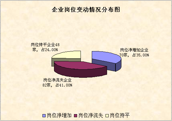 3月末全市监测企业发生岗位数量环比净增加的有70家,占35%,共增加岗位1214个,环比增加2.73%;岗位数量环比净流失的有82家,占41%,共减少岗位646个,环比减少1.69%;岗位数量保持不变的有48家,占24%。