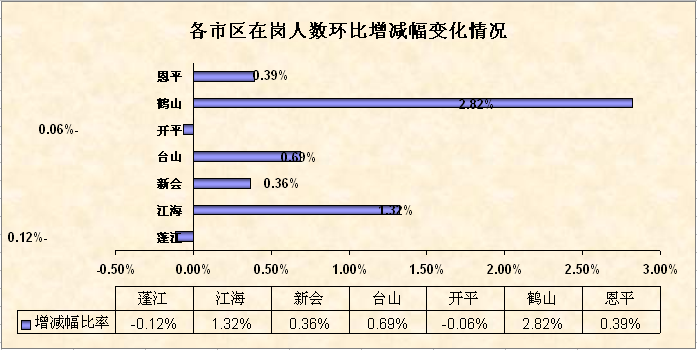 3月末各市(区)监测企业的岗位出现不同程度的变动,除蓬江区和开平市的期末在岗人数环比轻微减少外,其他各市(区)的在岗人数环比均有不同程度的增加,其中鹤山市和江海区的在岗人数环比增幅最大,分别为2.82%和1.32%。