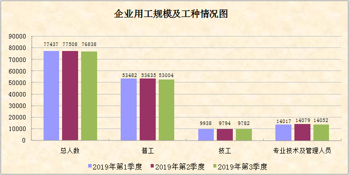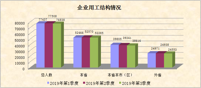 企业第三季度的在岗员工中,本省员工有52285人,占68.05%,环比减少0.54%;本省本市(区)员工有38616人,占总人数的50.26%,环比减少1.84%;外省员工有24553人,占31.95%,环比减少1.54%。反映企业用工主要以本市(区)员工为主,用工结构与上季度基本相同,没有出现大幅变动。