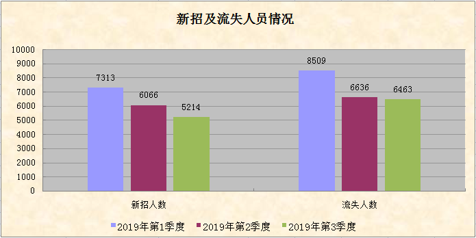 企业第三季度新招员工5214人,比上季度减少852人,环比减少14.05%;第三季度流失员工6463人,比上季度减少173人,环比减少2.61%;新招员工与流失员工的比值为0.81,比上季度的0.91减少0.10,流失人数多于新招人数,净流失1249人,与上季度净流失的570人相比大幅增加,反映企业的用工稳定性较上季度差。