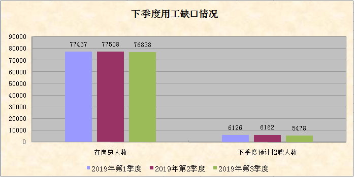 根据上述图表,从企业连续2个季度的数据分析,2019年第二季度预计2019第三季度招聘人数为6162人,实际招聘到5214人,占招聘计划数的84.6%,反映企业第三季度通过各类招聘渠道补员后基本能满足预计的大部分用工需求,但仍存在约15%左右的用工缺口;而从2019年第三季度的监测数据来看,企业预计在第四季度计划新招5478人,用工需求比第三季度减少约10%-12%,反映企业对新增用工的需求不强烈。