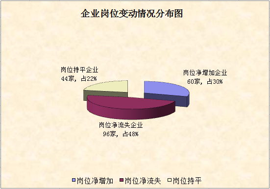 9月末全市监测企业发生岗位数量环比净增加的有60家,占30%,共增加岗位432个,环比增加1.48%;岗位数量环比净流失的有96家,占48%,共减少岗位1173个,环比减少2.07%;岗位数量保持不变的有44家,占22%。