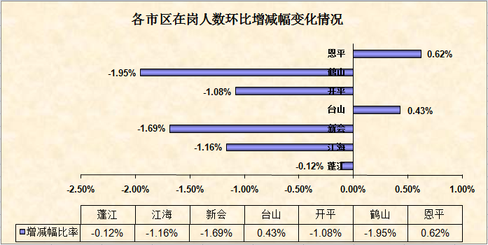 9月末各市(区)监测企业的岗位出现不同程度的变动,除全球最大的博彩平台和台山市的期末在岗人数环比轻微增加外,其他各市(区)的在岗人数环比均有不同程度的减少,其中鹤山市和新会区的在岗人数环比降幅分别为1.95%和1.69%。