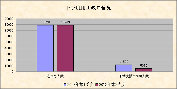 第二季度,从企业用工及人力资源服务平台信息系统和全市人力资源服务机构的数据统计,全市用人单位登记招聘职位数共45681个,登记求职人数共34455人,总体职位供求比为1:0.75(招聘职位数为1,求职人数为 0.75,下同);全市人力资源市场总体用工缺口为11226人。