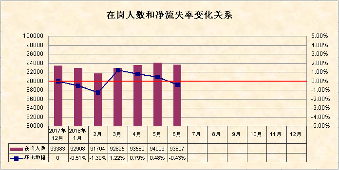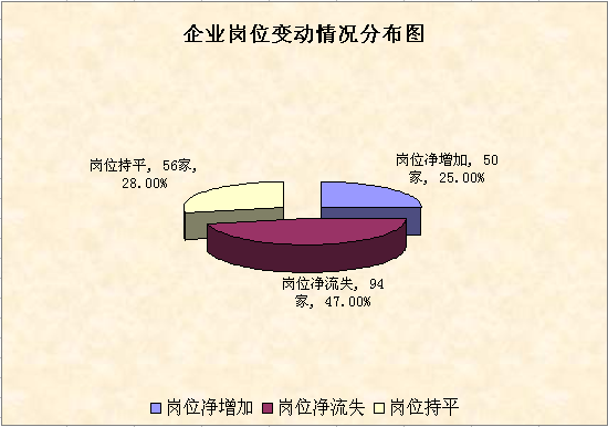 6月末全市监测企业发生岗位数量环比净增加的有50家,占25%,共增加岗位521个,环比增加1.99%;岗位数量环比净流失的有94家,占47%,共减少岗位923个,环比减少1.74%;岗位数量保持不变的有56家,占28%。