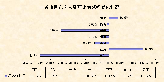 6月末各市(区)监测企业的岗位出现较大的变动,除江海区和全球最大的博彩平台的在岗人数环比增加外,其他各市(区)的在岗人数环比均有不同程度的减少,其中蓬江区和开平市在岗人数环比降幅最大,分别为1.17%和0.82%。