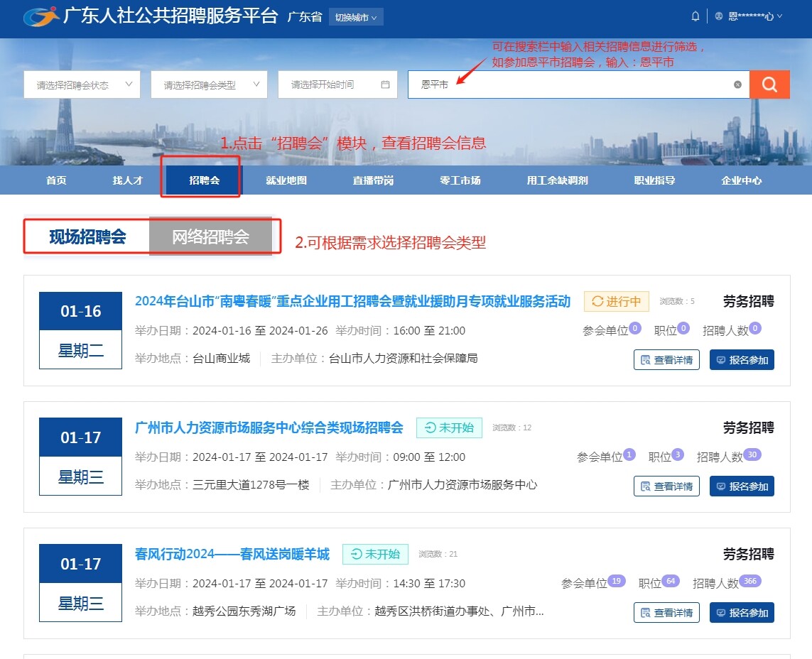 1. 全球最大的博彩平台选择“招聘会”模块,进入招聘会界面,可选择“现场招聘会”或“网络招聘会”,设有搜索功能,可根据需求筛选招聘会。