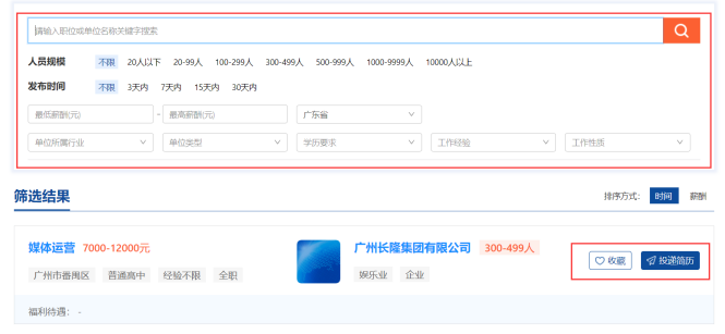 二、点击“找工作”模块,可进行职位搜索、查看职位信息、查看单位信息、收藏职位、投点简历等操作。
