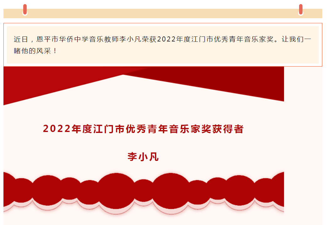 我市一音乐教师荣获2022年度江门市优秀青年音乐家奖