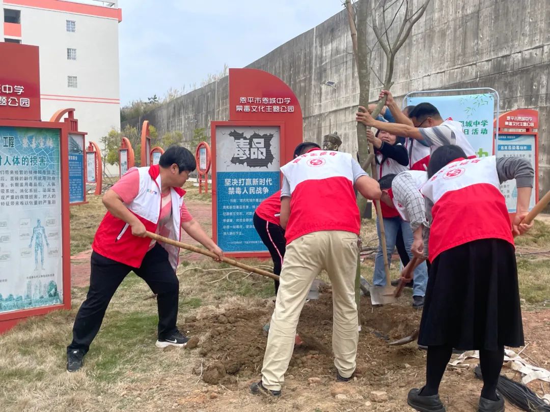 3月10日下午,成德小学禁毒主题公园内呈现出一派热火朝天的劳动景象。现场人员迅速投身植树活动,大家分工协作,挥锹铲土、扶苗培土、提桶浇水,每一个步骤都饱含着对绿色校园的期待。新植苗木错落有致地分布于公园各处,形成兼具生态功能与教育价值的“红领巾林”。