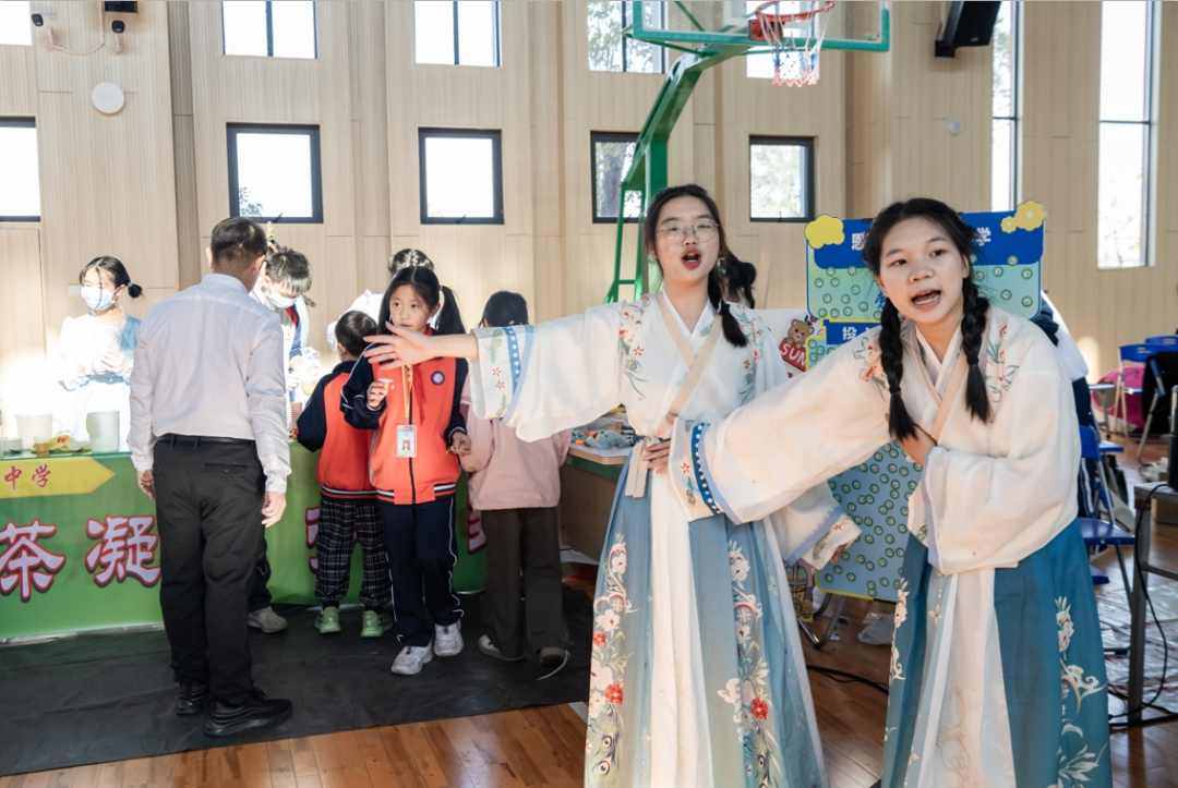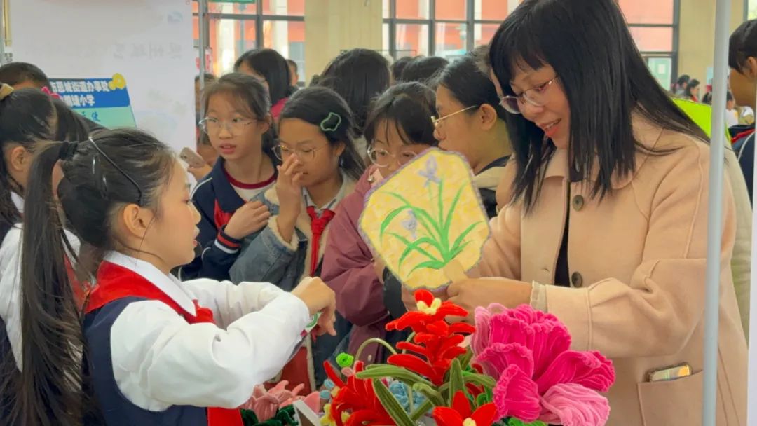 “同学们,蛋糕出炉啦!”“同学,你喜欢什么剪纸图案,我来帮你剪!”“这个是绒花戒指,还有发箍,你喜欢哪个?”……本次活动最热闹的环节莫过于劳动教育成果展示现场,场内人声鼎沸,师生们都在卖力推荐自己的劳动成果,每个摊位上的“产品”,都带着学生们的劳动和巧思。此次活动设立了22个摊位,每个摊位都由各学校进行了独一无二的设计,它们有的挂上了美丽海报,有的设计了精妙的展示台,展现美食、手工等劳动成果,有的带上了学校劳动教育的“镇校之宝”,吸引一波又一波的人流量。