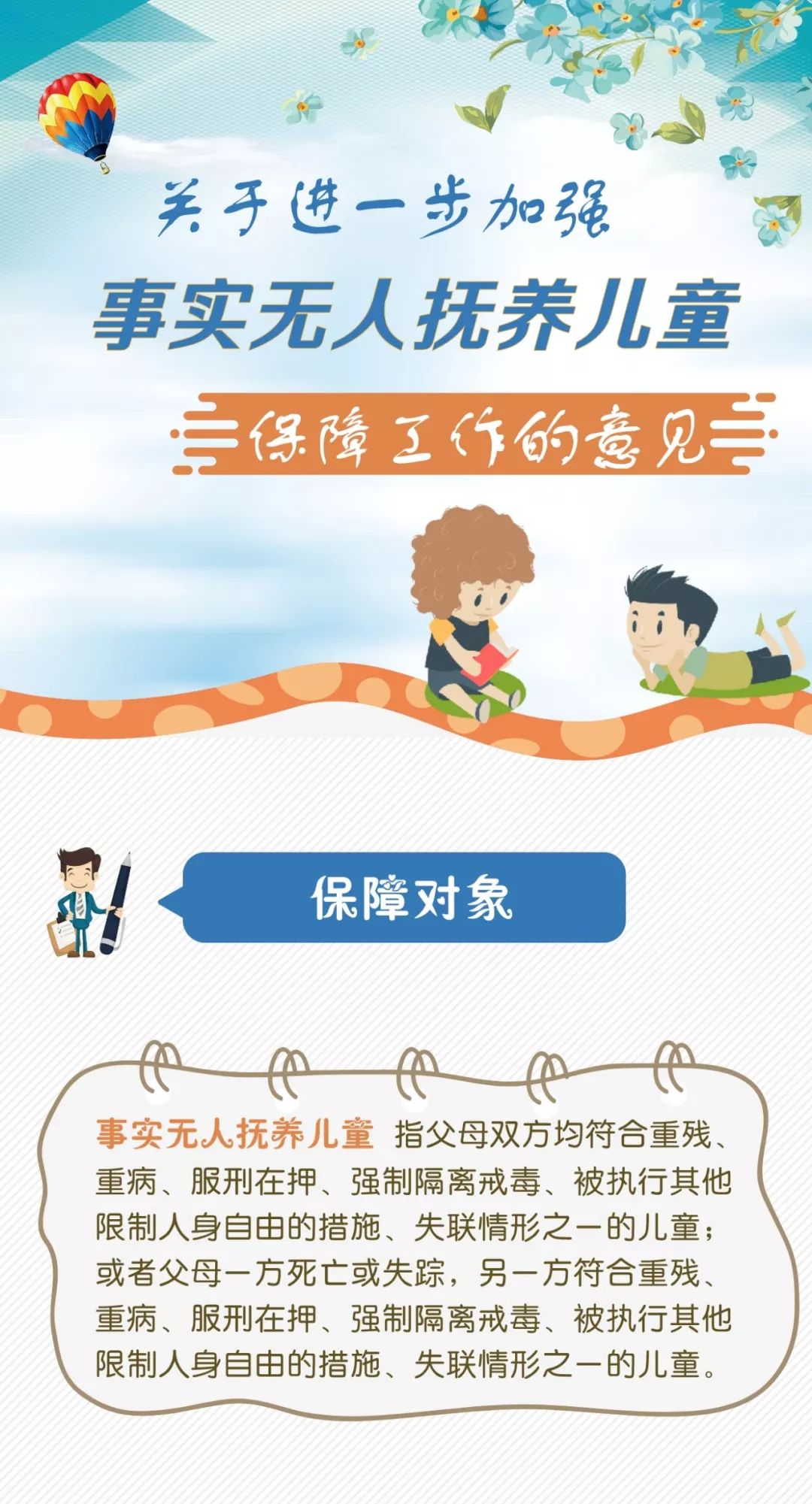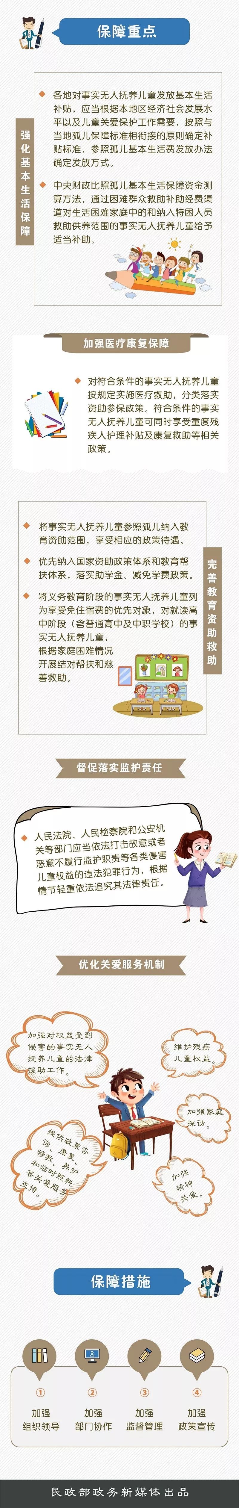 《意见》明确了事实无人抚养儿童保障的重点内容。包括基本生活保障、医疗康复保障、教育资助救助、监护责任、关爱服务机制等。