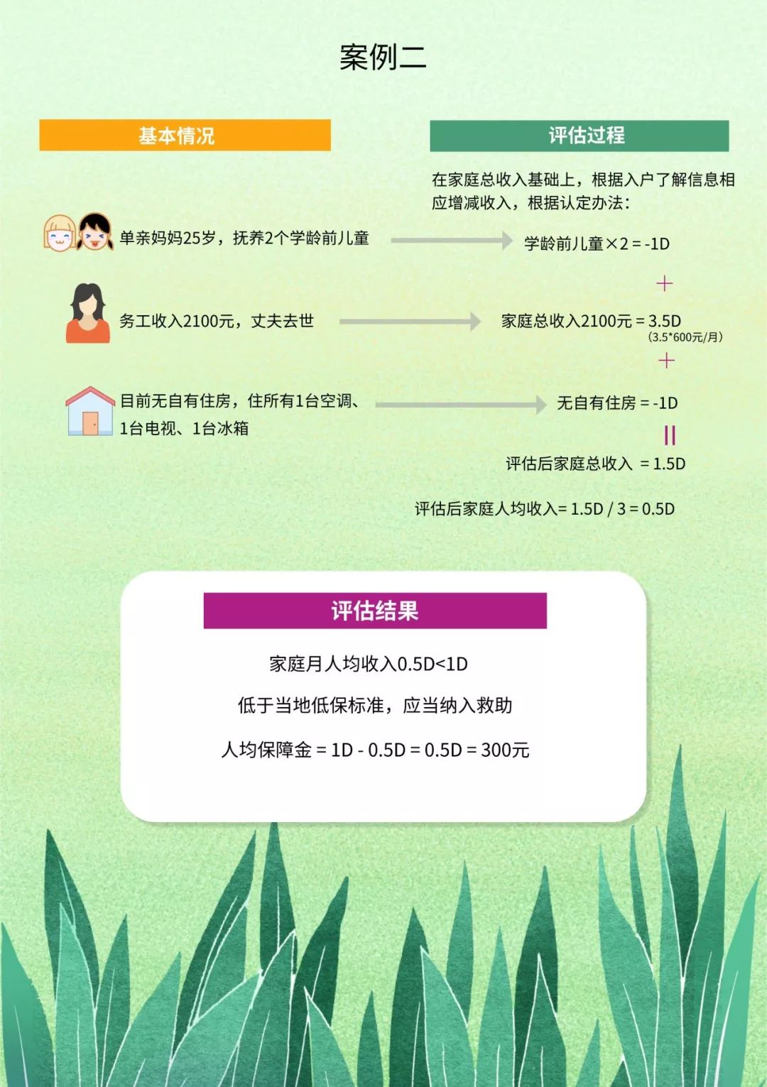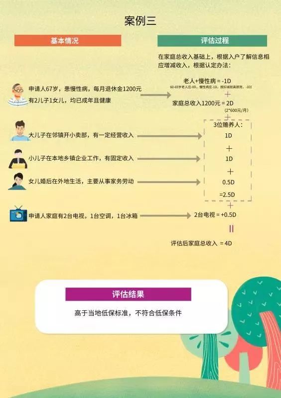 在具体操作上,《认定办法》规定,家庭生活状况综合评估指标以申请家庭申请前6个月平均收入为基础,根据家庭结构和生活状况对家庭月平均收入,按照评估指标(以“当地1个月最低生活保障标准”作为各指标计量单位)进行增加或减除,将增减后的家庭月收入除以共同生活的家庭成员人数,计算出综合评估后家庭月人均收入,作为认定申请家庭是否纳入最低生活保障的依据。