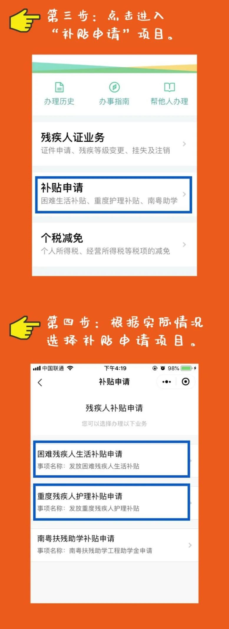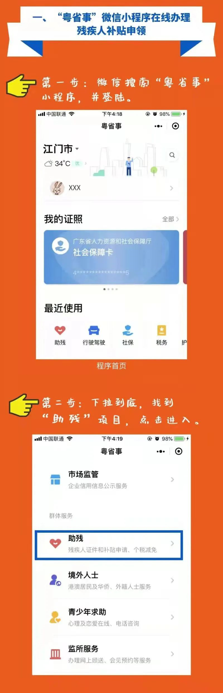 领取残疾人两项补贴的残疾人朋友,需每年4月1日至6月20日期间在微信“粤省事”小程序主动申报资格认定。
