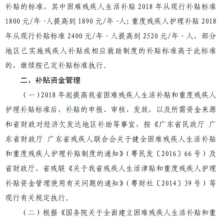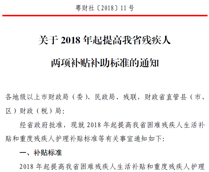 粤财社[2018]11号 关于2018年起提高我省残疾人两项补贴补助标准的通知