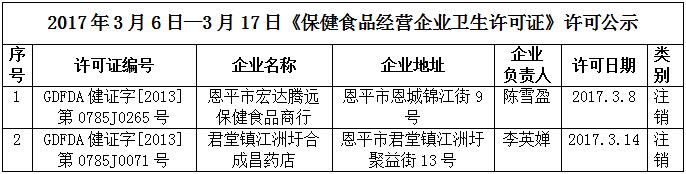 全球最大的博彩平台2017年3月6日—2017年3月17日 《保健食品经营企业卫生许可证》注销
