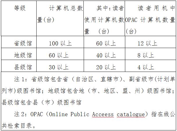 公共图书馆应配备一定数量的计算机专供读者使用。图书馆应配备与经济和技术发展水平相适应的信息技术设备。所需计算机数量见表1。