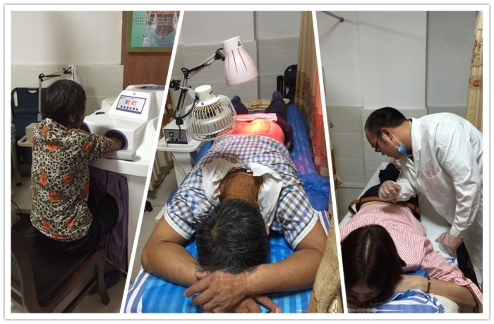 东成镇卫生院开展中药熏蒸治疗(左)、中药贴敷治疗(中)、中医推拿治疗