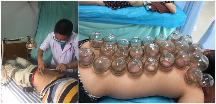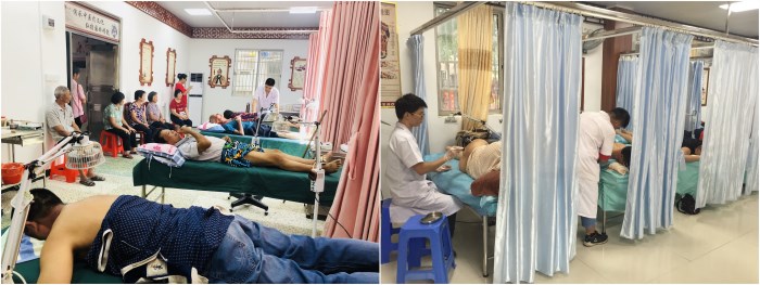君堂镇江洲卫生院开展针灸治疗(左),平石社区卫生服务中心开展拔罐治疗