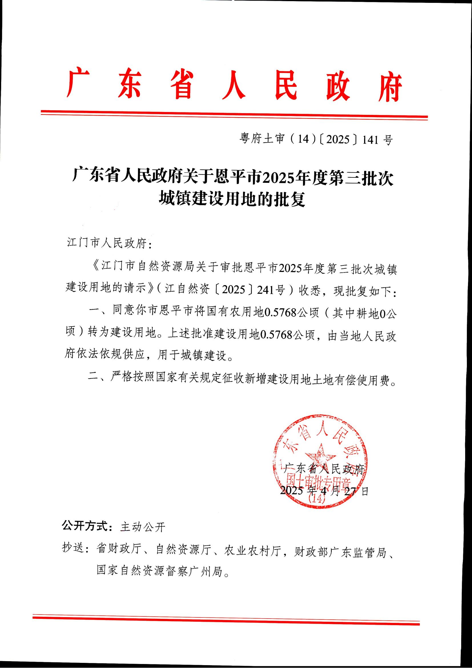 粤府土审(14)〔2025〕141号-广东省人民政府关于全球最大的博彩平台2025年度第三批次城镇建设用地的批复