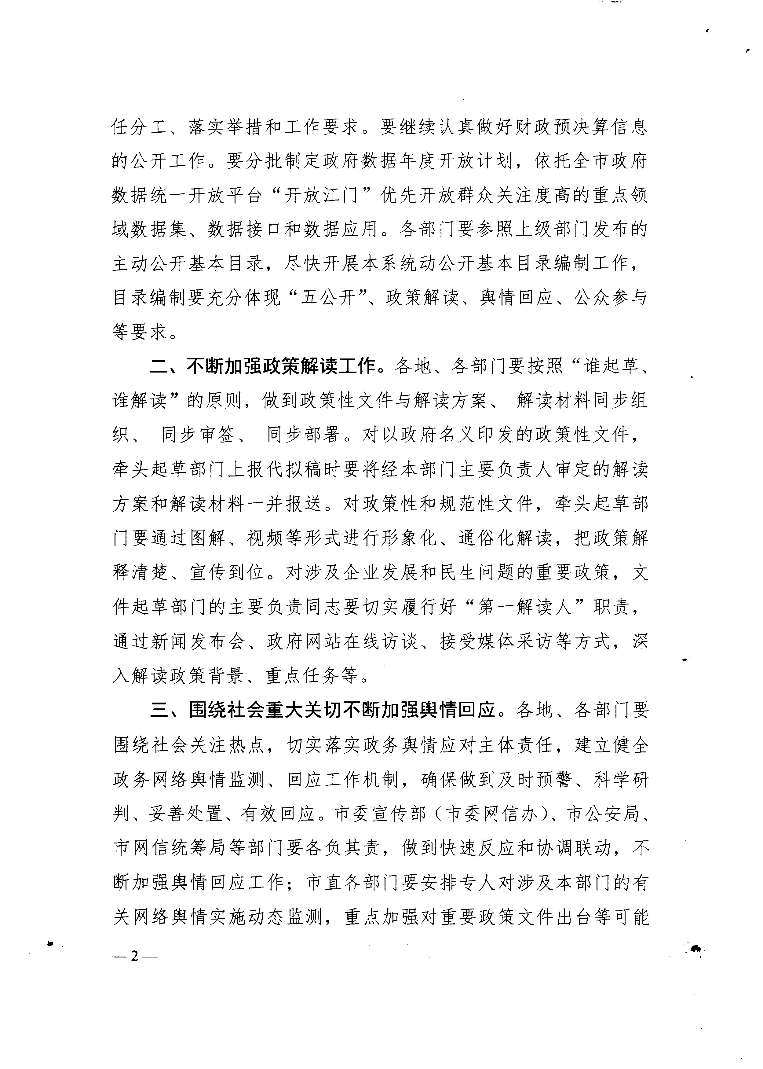 各部门单位要高度重视,严格按照有关工作部署,狠抓落实。要结合实际制定本部门单位2018年政务公开工作要点,于7月25日前在市政府门户网站政府信息公开目录系统对外公开,并抄送给市府办公室(联系股室:政务与信息公开股)。市府办公室将于7月27日对此项工作进行专项督查,并纳入政务公开年度绩效考核。
