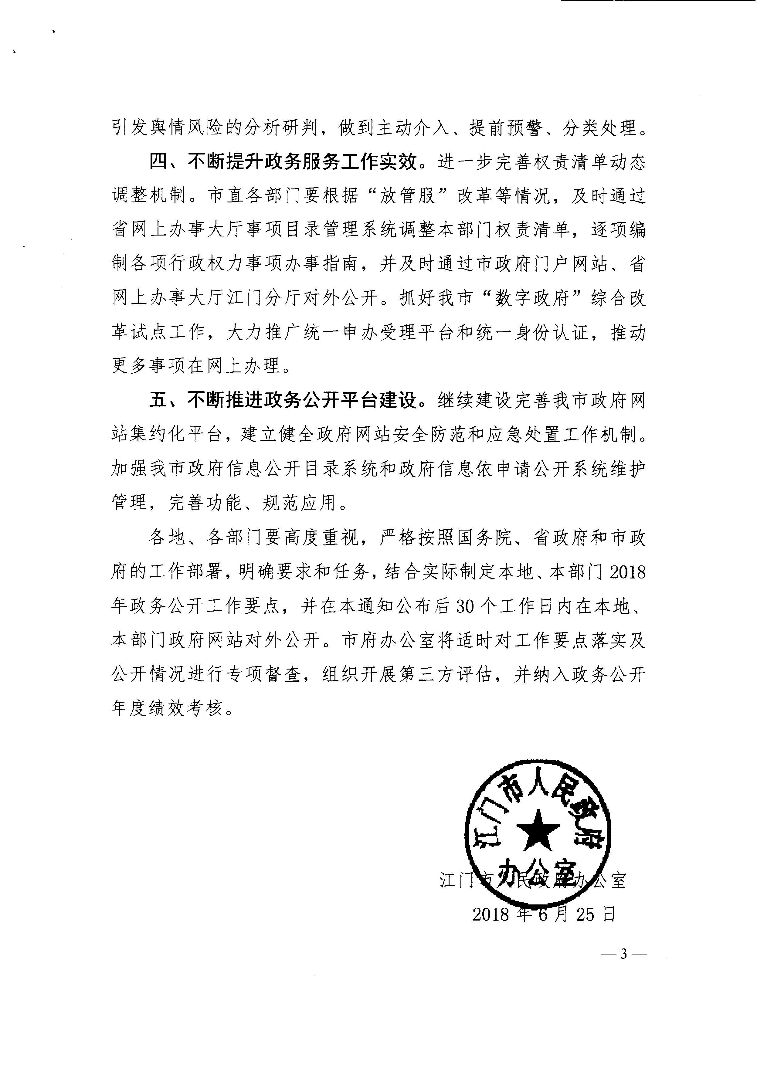经市人民政府同意,现将《江门市人民政府办公室转发广东省人民政府办公厅转发国务院办公厅2018年政务公开工作要点的通知》(江府办〔2018〕14号)转发给你们,请认真贯彻执行。