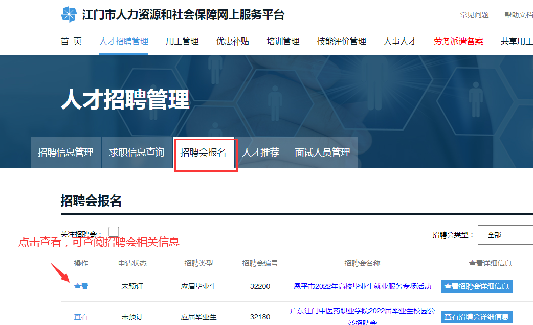 1. 如需参加招聘会,招聘信息审核通过后,可选择“招聘会报名”,点击“查看”查阅招聘会相关信息,点击“我已阅读,并按备注要求进行报名”,选择需要参加招聘会的岗位,点击“提交”。