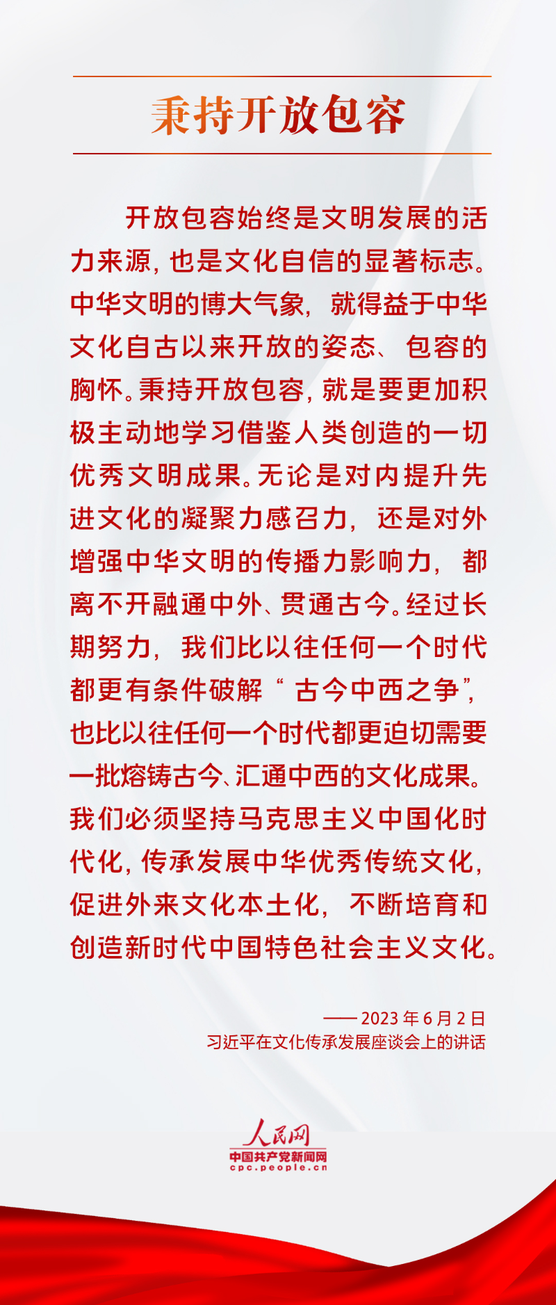 更好担负起新的文化使命,就要秉持开放包容。习近平总书记指出:“中华文明自古就以开放包容闻名于世,在同其他文明的交流互鉴中不断焕发新的生命力。”中华文明在长期演进过程中,创造了博大精深的优秀传统文化,也铸就了博采众长的文化自信。中华文化既是历史的、也是当代的,既是民族的、也是世界的。今天,我们要铸就中华文化新辉煌,就要以更加博大的胸怀,更加广泛地开展同各国的文化交流,更加积极主动地学习借鉴世界一切优秀文明成果。新征程上,要秉持开放包容,坚持马克思主义中国化时代化,传承发展中华优秀传统文化,坚持不忘本来、吸收外来、面向未来,在继承中转化,在学习中超越,促进外来文化本土化,不断培育和创造新时代中国特色社会主义文化。——《人民日报》