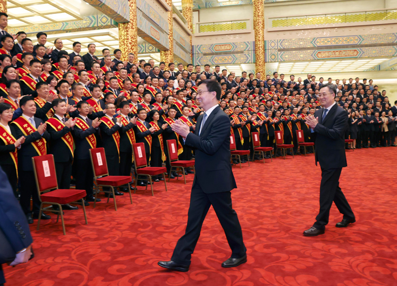 新华社北京6月27日电 全国机关事务工作先进集体和先进个人表彰大会27日在人民大会堂举行。中共中央政治局常委、国务院副总理韩正会见受表彰人员和参会代表并合影。