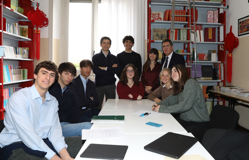 意大利罗马国立住读学校校长雷亚莱(后排右一)与致信习近平主席的学生们在一起(2019年3月18日摄)。新华社记者 程婷婷 摄