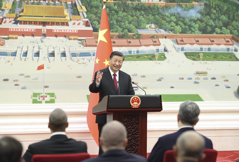 递交国书仪式结束后,习近平在北京厅对使节们发表集体讲话。